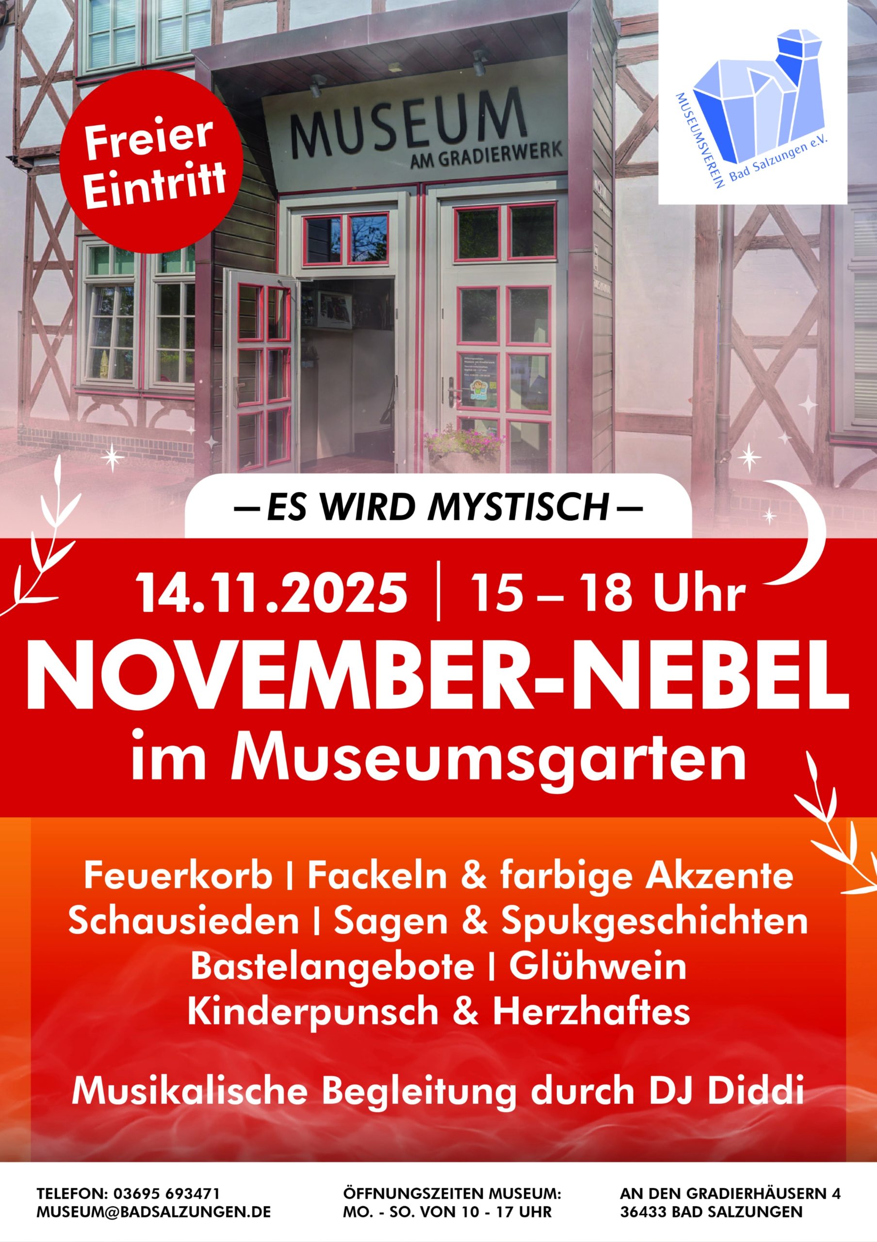 Zum Herbstausklang wabern Nebelschwaden durch das Werratal. Mit farbigem Licht, Fackeln und Klang entsteht im Museumsgarten eine besondere Atmosphäre. Während die Siedepfanne dampft, werden Sagen- und Spuckgeschichten erzählt. Während die Siedepfanne dampft werden Sagen- und Spuckgeschichten erzählt. Darüber hinaus können unsere Kleinen ihrer Bastelleidenschaft frönen und die Erwachsenen sich an den an diesem Tag besonderen farblichen Akzenten erfreuen. Die musikalische Umrahmung ist bei DJ Diddi in besten Händen. Für Speis und Trank ist gesorgt. Der Eintritt ist frei.